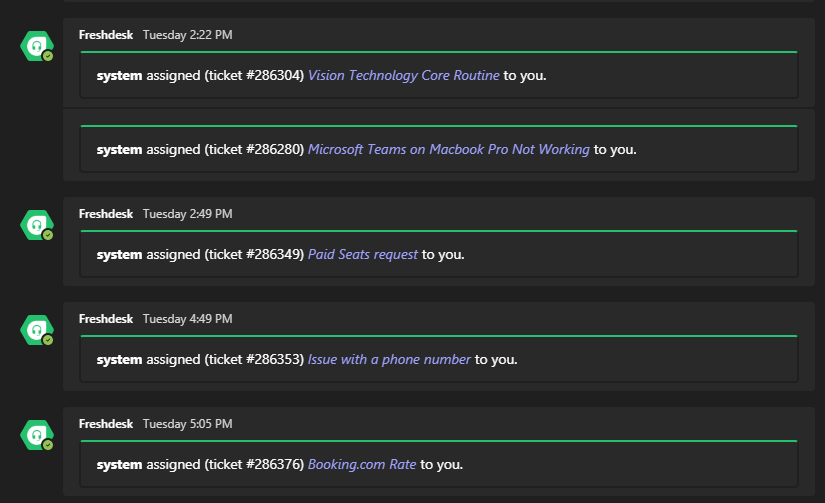 Huzzah! You will now recieve notifications in Teams of new tickets, and ticket updates: