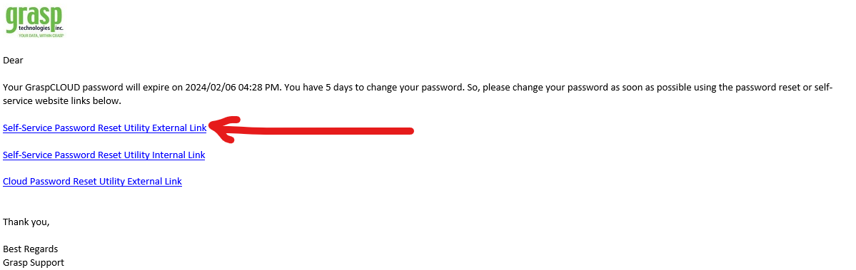 Please keep an eye out for password expiration emails from GraspCLOUD. you will begin receiving 14 days prior to your password expiring. Resetting your password in advance prevents you from having to reset your password in a pinch!