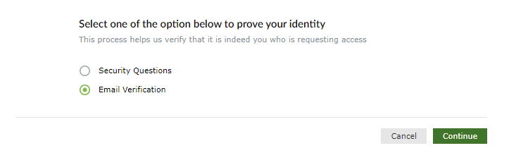 - Choose Email Verification if you do not have nor know the answers to your Security Questions.