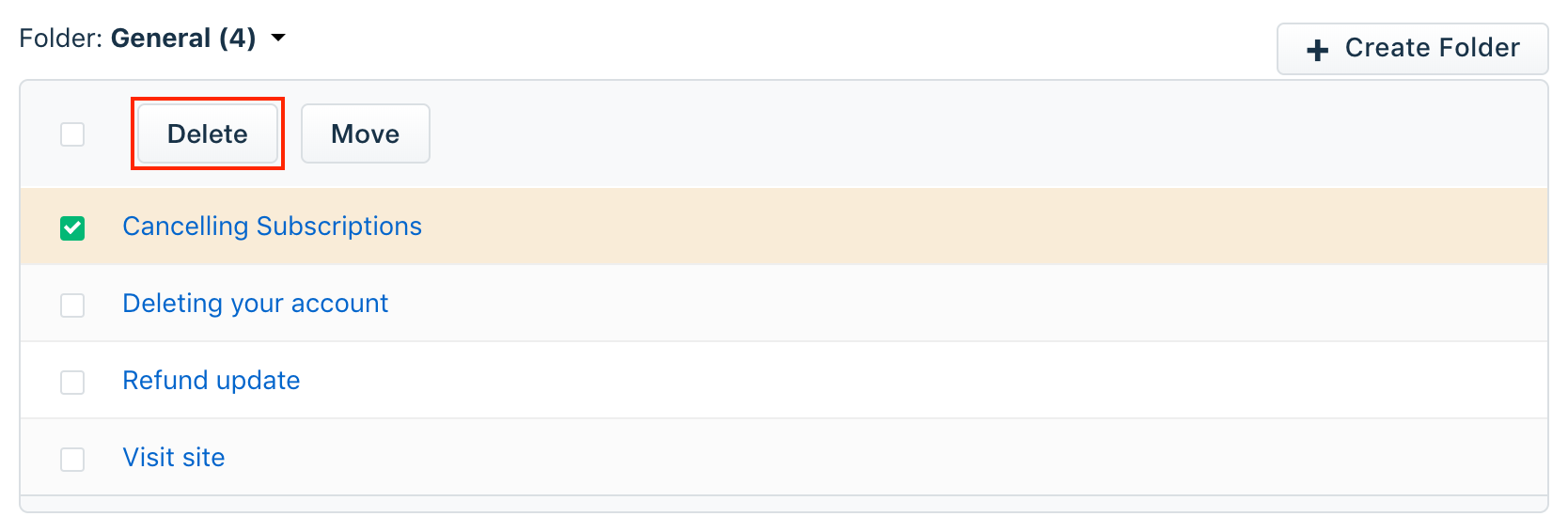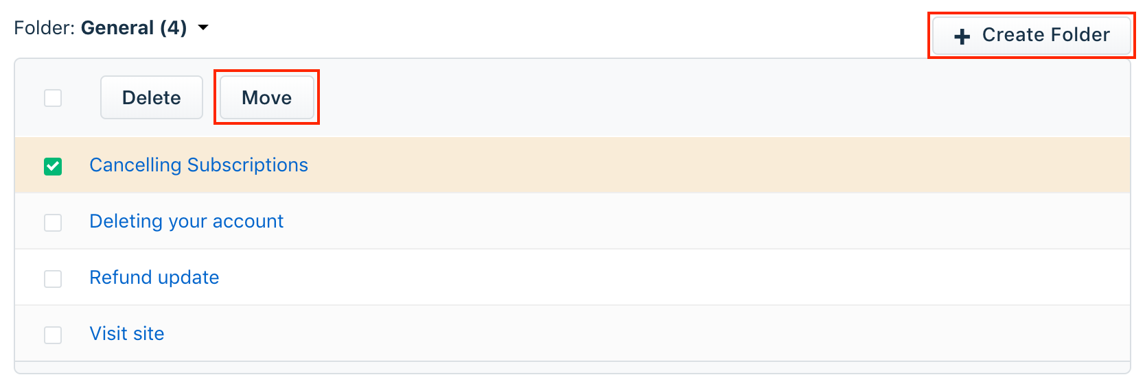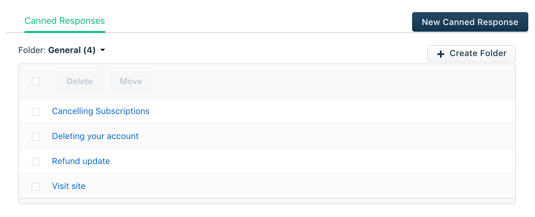 Organize your canned responses into folders for easier categorization. Click on +Create Folder to create a folder, and Move to order and move your canned responses between folders as you like.