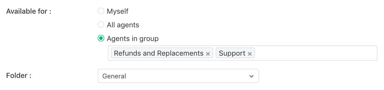 - You can also make the response visible to a particular group only - for example, a canned response for 'Refund' can be made visible just to your 'Returns and Refunds' team, as other teams will have no use for it. This option also allows you to select multiple groups.