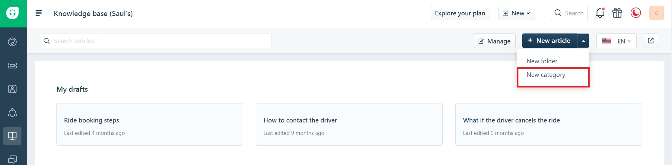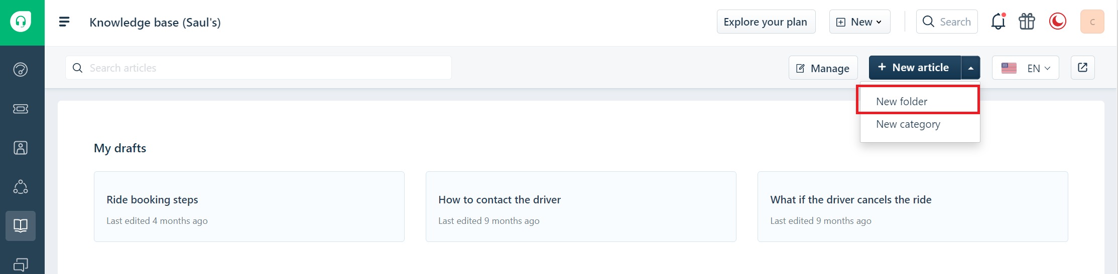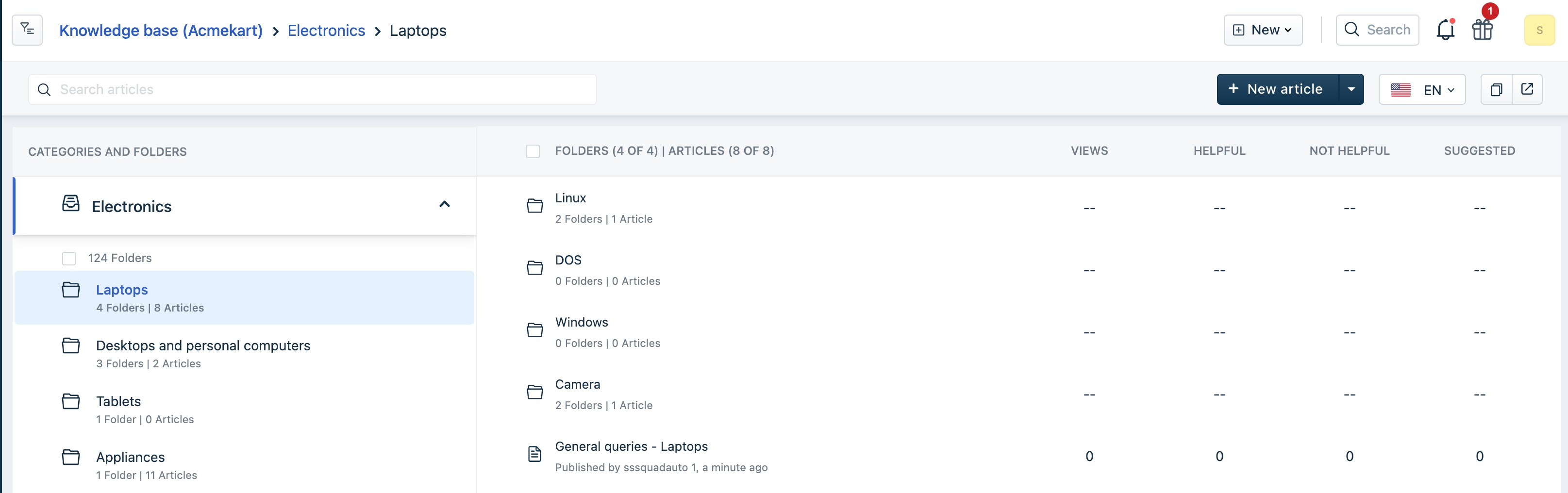 Note: Flexible hierarchy is available only on the Enterprise plan. If you are on other plans, you can organize your knowledge base up to 3 levels. Category > Folder > Article.