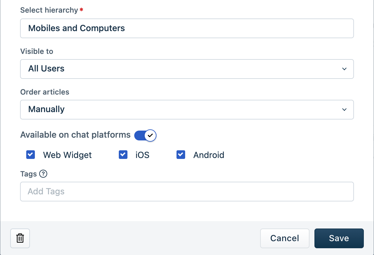 - You can also choose to make your folders available on your chat platforms and choose between web widgets, iOS, or Android. You can also add tags to your folders to filter them and deliver a personalized experience to your customers.