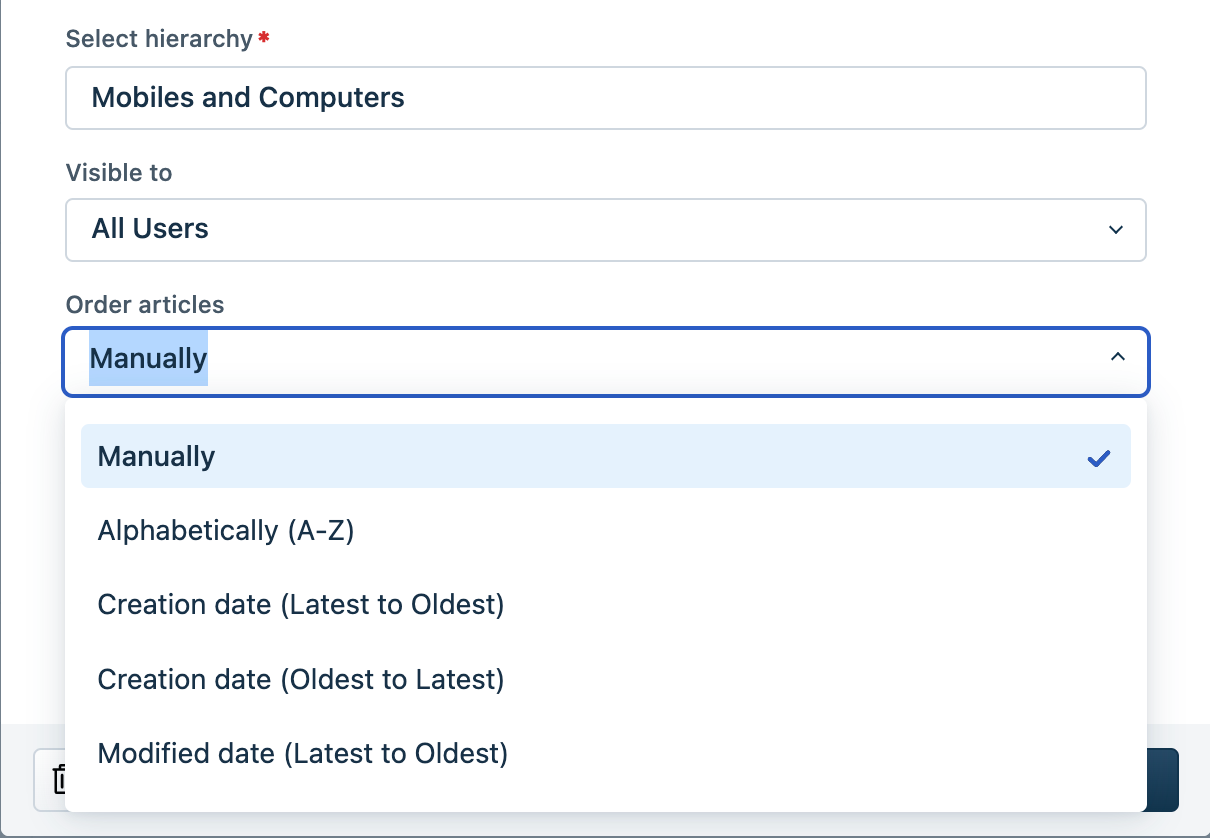 - After selecting the hierarchy level of your folder, you can choose to order them manually or auto-sort them based on alphabetical order, creation date, or modified date.