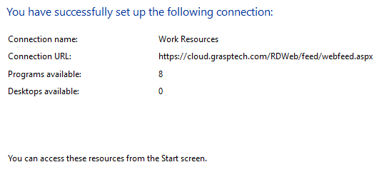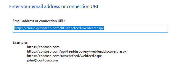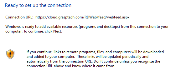 - Enter the connection URL: https://cloud.grasptech.com/RDWeb/feed/webfeed.aspx and click Next