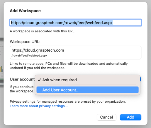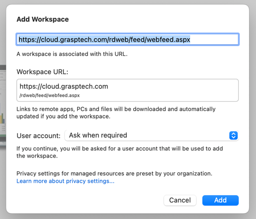 - In the Add Workspace window, type: https://cloud.grasptech.com/rdweb/feed/webfeed.aspx into the first field, then click Add.