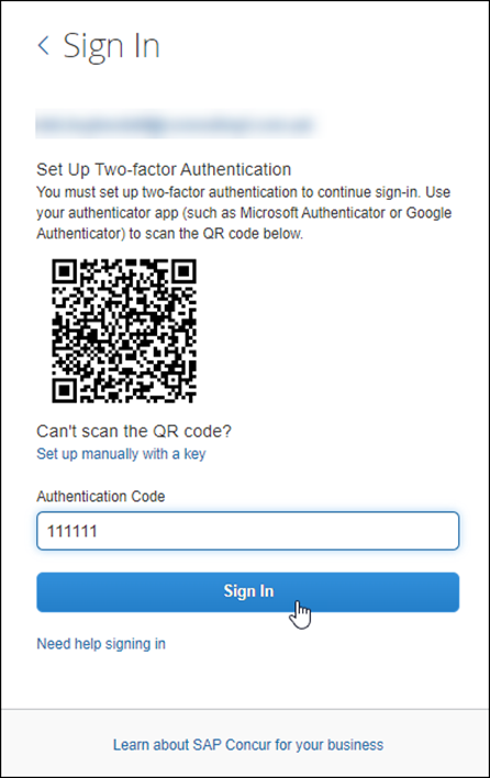 - On the SAP Concur Sign In page, enter the 6-digit code into the Authentication Code field in the Set Up Two-Factor Authentication section and then click Sign In.