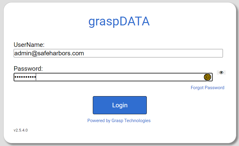 - Log into Grasp DATA using the admin@safeharbors.com account.