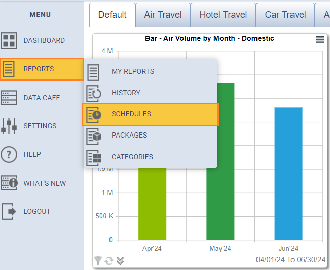 - Click REPORTS on the left menu and then SCHEDULES.