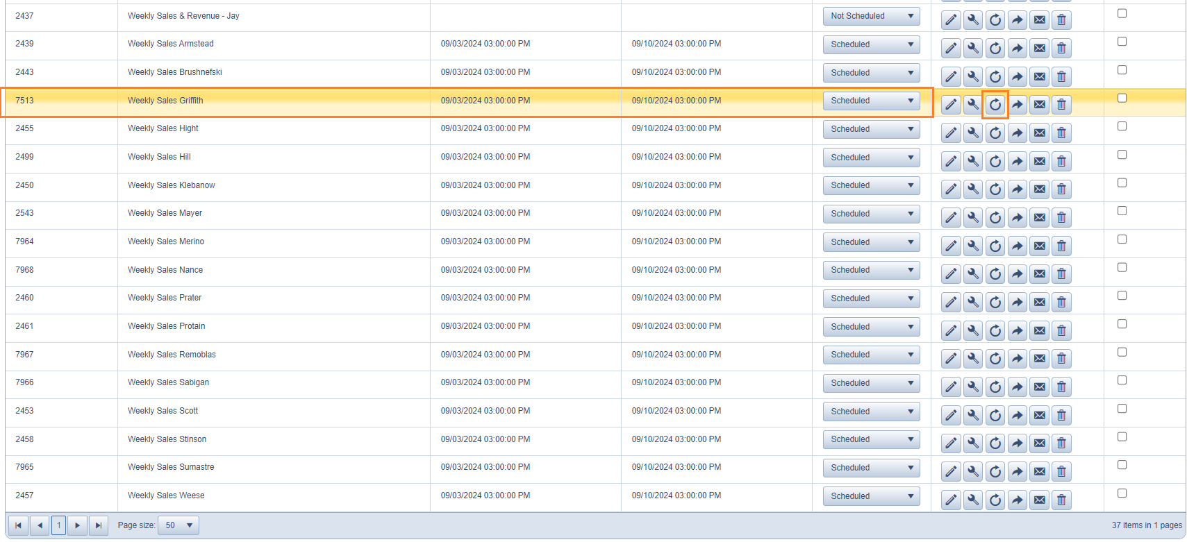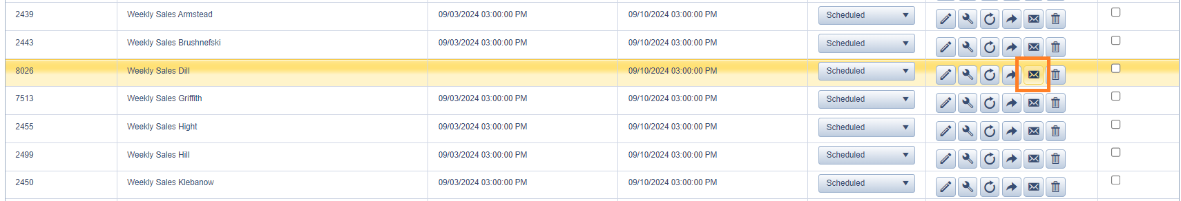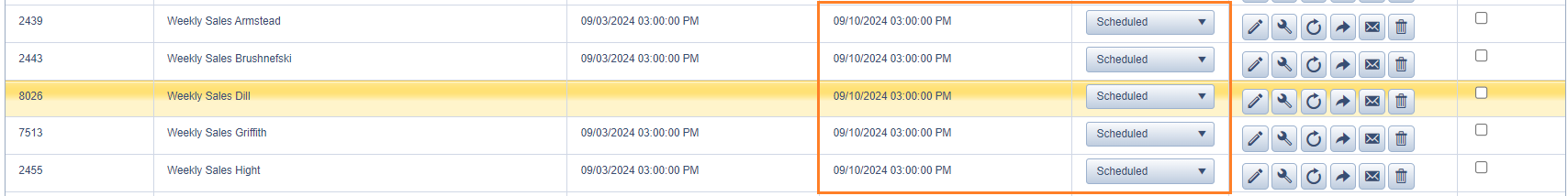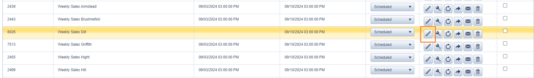 - Scroll to the bottom of the list and you'll see our current list of "Weekly Sales" reports. Choose any one of them to copy (we will edit later) and click the circle icon with an arrow.