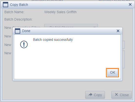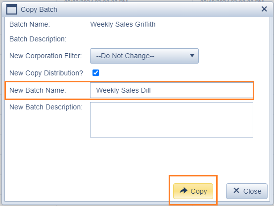 - The Copy Batch window appears. Enter a name for the new Batch and click copy. Please follow the existing format of "Weekly Sales" followed by the agents last name.
