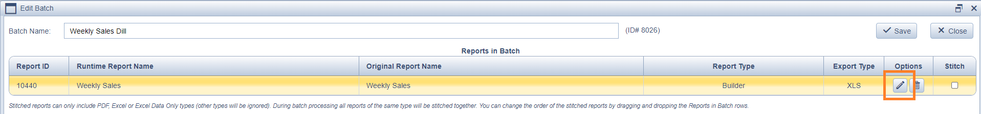 - Click the pencil icon inside the Edit Batch screen to edit the report filters.