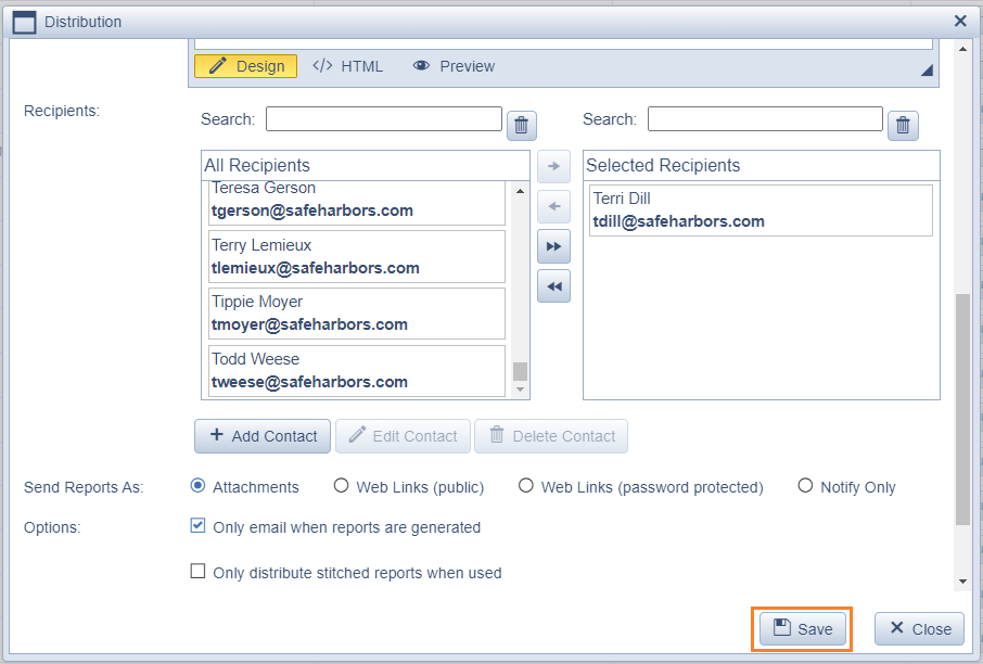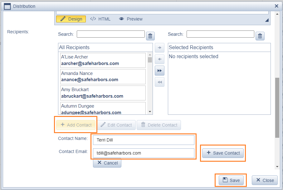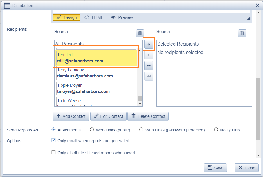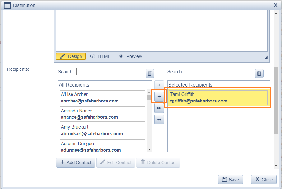 - Scroll down to your newly added contact and click the name, and the forward arrow to add to the distribution.