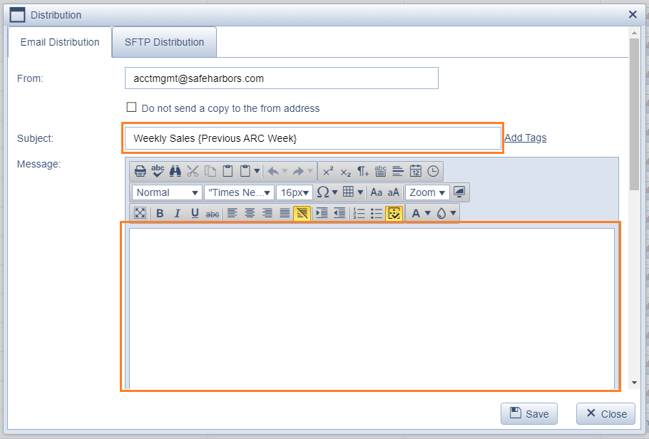 - In the Distribution screen set the Subject to Weekly Sales {Previous ARC Week}, and clear out the body section.