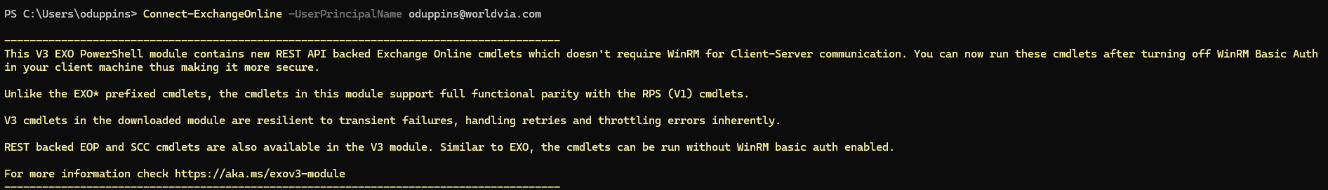 - Connect to Exchange Online: Connect-ExchangeOnline -UserPrincipalName <yourEmail>
